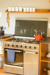 * Kitchen equipped with large fridge, chest freezer, gas stove and oven, microwave, kettle, toaster.